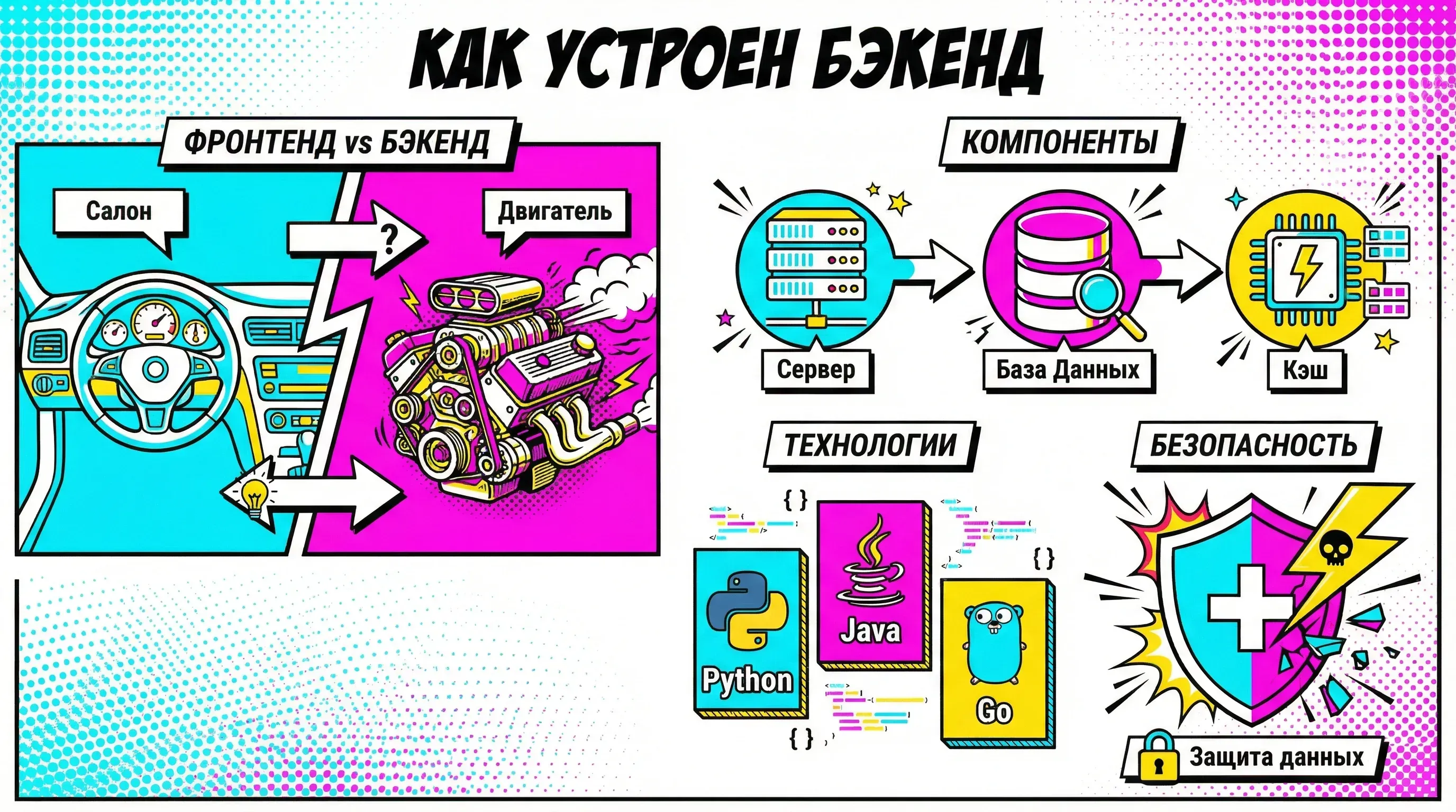 Бэкенд — это двигатель, трансмиссия, электроника. Водитель не видит эти компоненты, но без них машина не поедет. И если двигатель работает плохо — неважно, насколько красив салон.