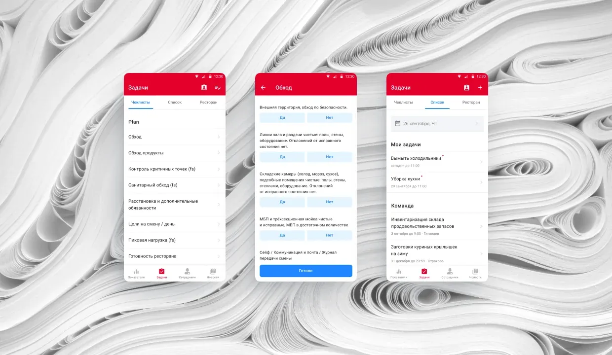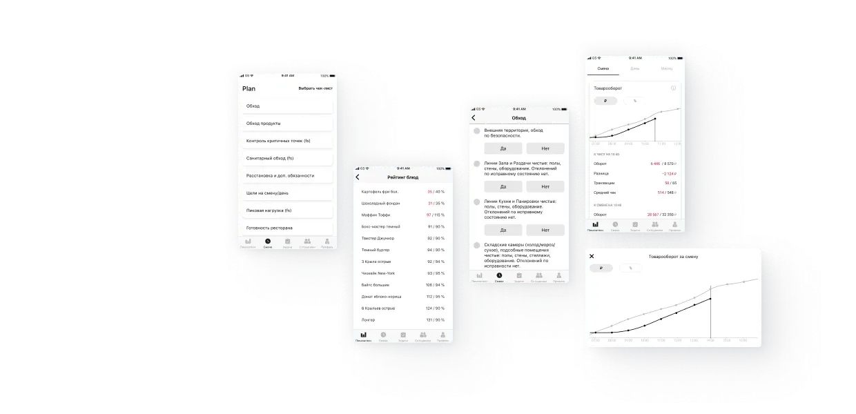 - Директора ресторанов. Дашборд с операционными показателями, общий список задач ресторана, а также отчёты о выполнении чек-листов и целей сотрудниками.