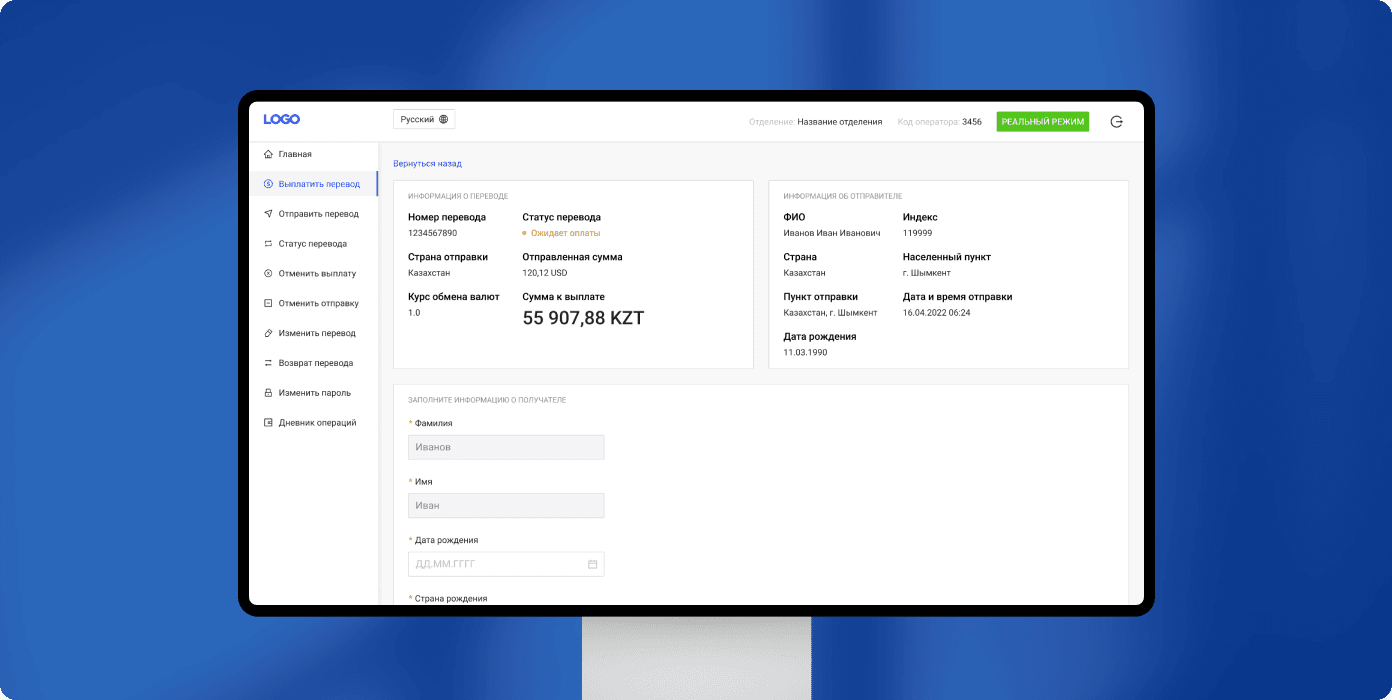 Залог надёжно работающего инструмента — отсутствие лишних деталей и отвлекающих факторов. Особенно когда дело касается денег и есть риск «человеческого фактора». Мы учли эти особенности при проектировании главной страницы интерфейса. Сделали её лаконичной и интуитивно понятной. Концепция реализована в сдержанном дизайне, не отвлекающем оператора от главного.