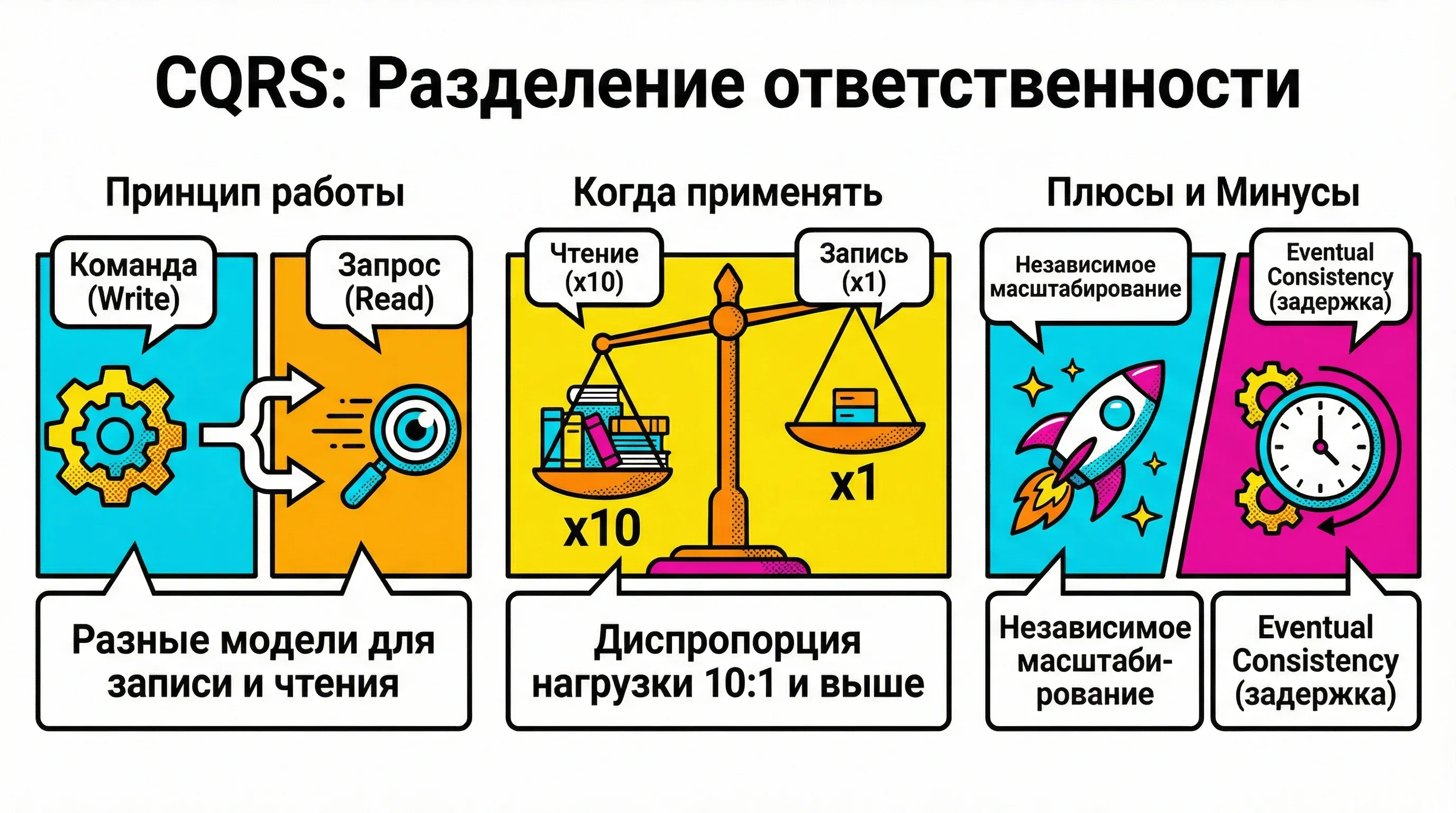 CQRS — мощный архитектурный паттерн, который решает реальные проблемы масштабирования и производительности. Но, как и любой паттерн, он требует осознанного применения: не ради моды и не потому что «так правильно», а потому что это решает конкретную проблему вашего бизнеса.