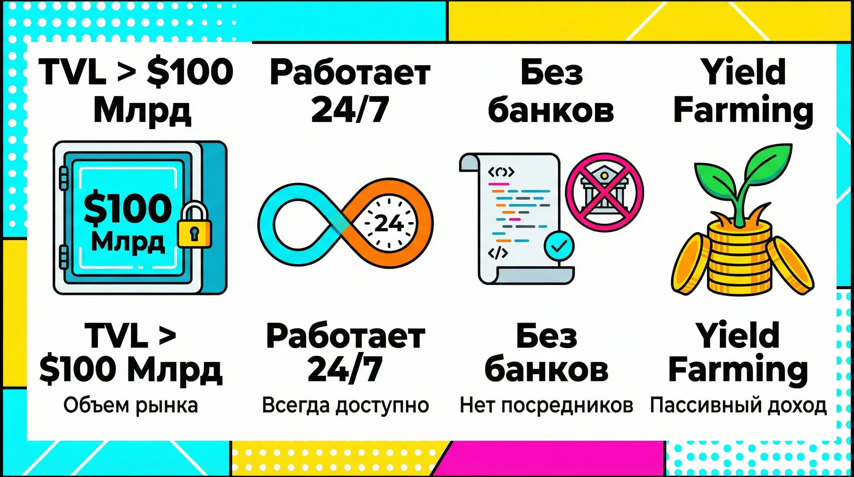 Представьте финансовую систему, которая работает 24/7 без выходных, не требует посредников в виде банков и доступна любому человеку с интернетом. Это не фантастика — это DeFi, децентрализованные финансы, которые уже сегодня обрабатывают транзакции на десятки миллиардов долларов.