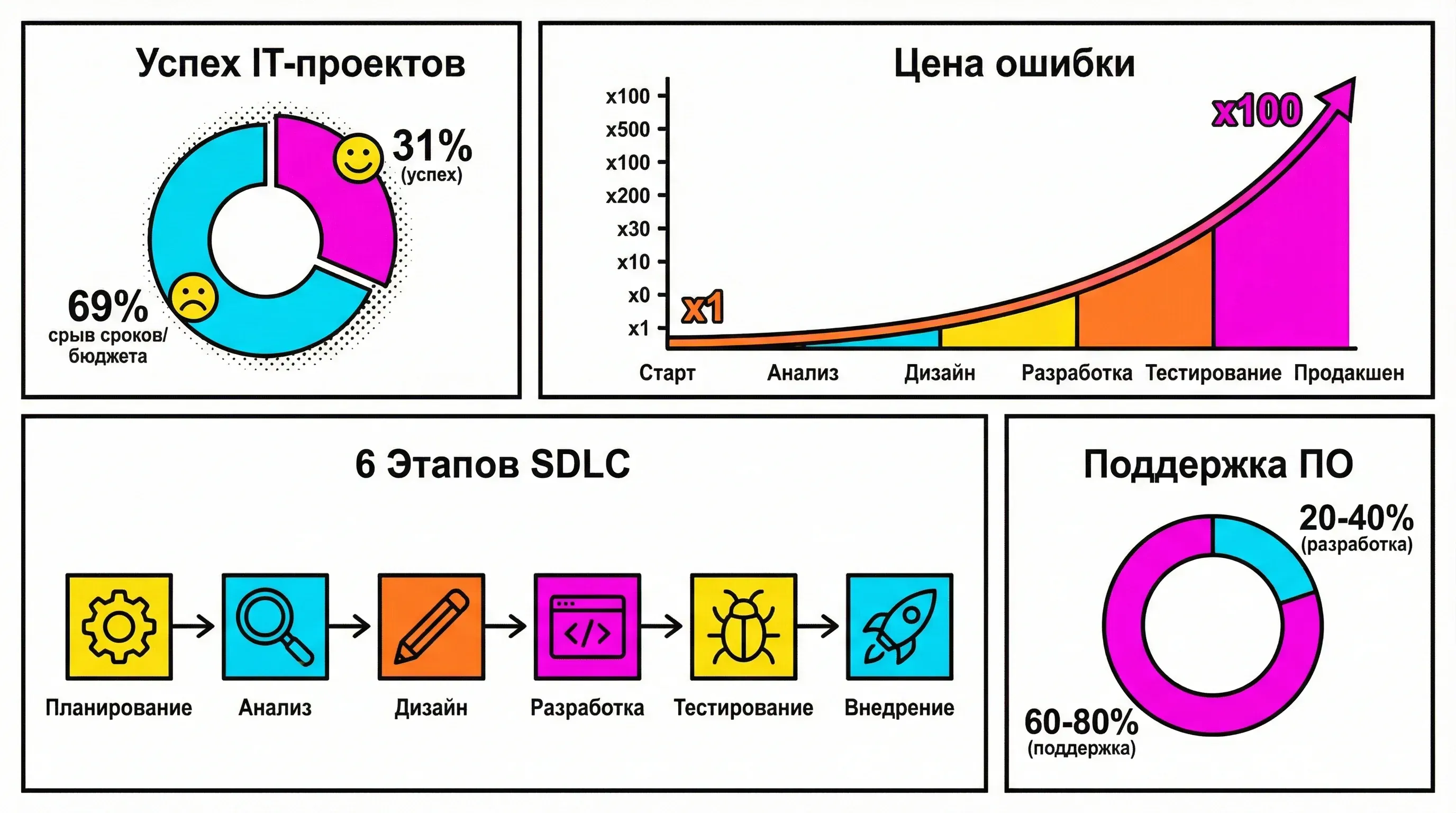 По данным Standish Group, только 31% IT-проектов завершаются успешно — в срок, в рамках бюджета и с заявленной функциональностью. Остальные 69% либо выходят за рамки бюджета, либо срываются по срокам, либо не выполняют поставленных задач. И главная причина — не в плохих разработчиках, а в нарушении или игнорировании этапов разработки программного обеспечения.