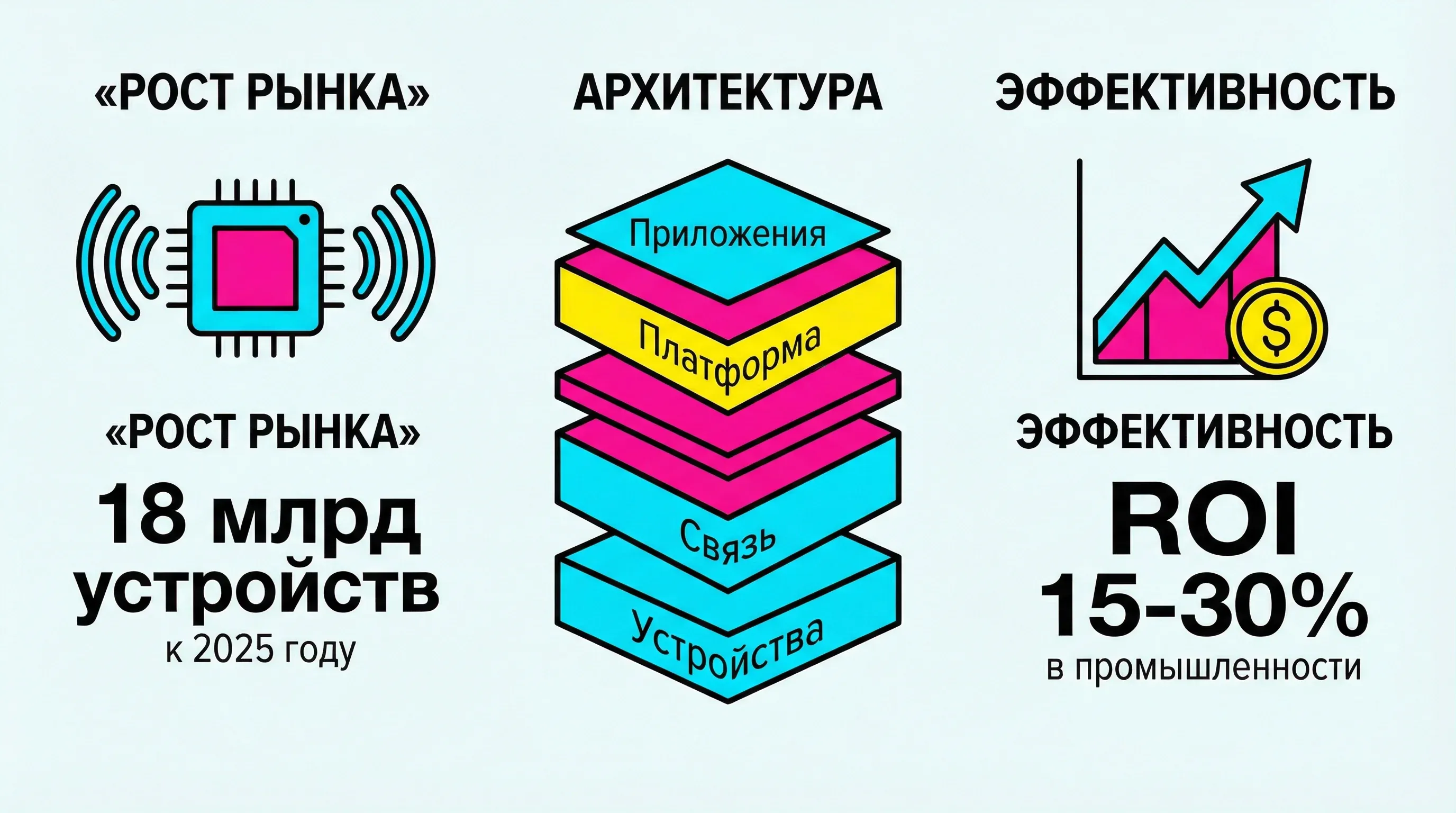 Инвестиции в IoT оправданы измеримым бизнес-эффектом. По данным McKinsey, IoT-решения в промышленности показывают ROI от 15% до 30% за счёт: