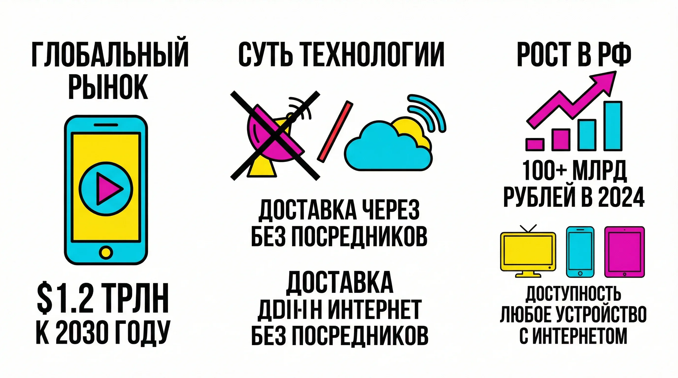 По данным Grand View Research, глобальный рынок OTT-сервисов достигнет $1.2 трлн к 2030 году при среднегодовом темпе роста 29.5%. В России, согласно J'son & Partners Consulting, рынок легальных видеосервисов превысил 100 млрд рублей в 2026 году. Это не просто тренд — это новая реальность медиапотребления.