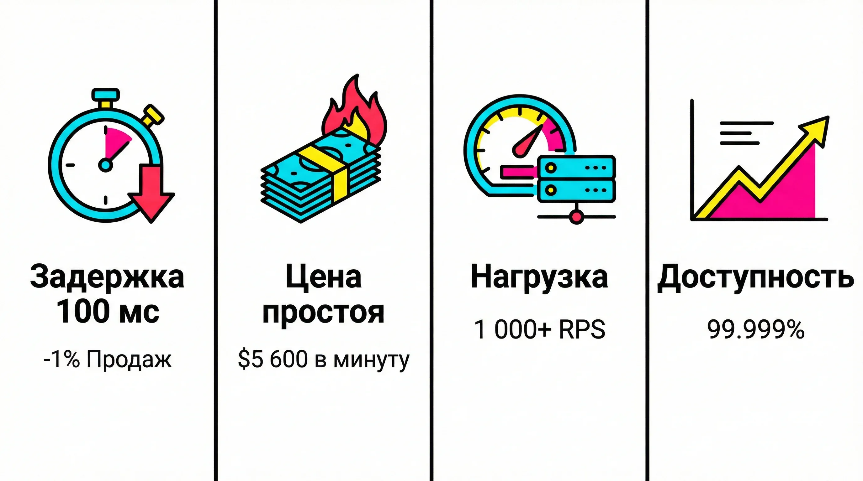 Бизнес-критичность доступности. Минута простоя стоит больше, чем час работы команды разработки. Для банков, маркетплейсов, сервисов доставки это типичная ситуация.
