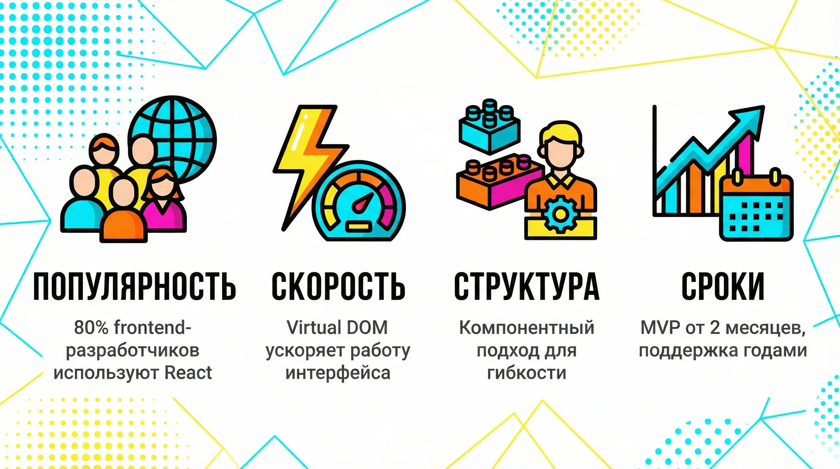 Вы планируете запустить MVP, а затем развивать продукт годами — добавлять новые функции, масштабировать команду, выходить на новые рынки? Компонентная архитектура React окупится многократно. Код остаётся структурированным даже при росте проекта, новые разработчики быстро погружаются в работу, изменения в одной части не ломают другие.