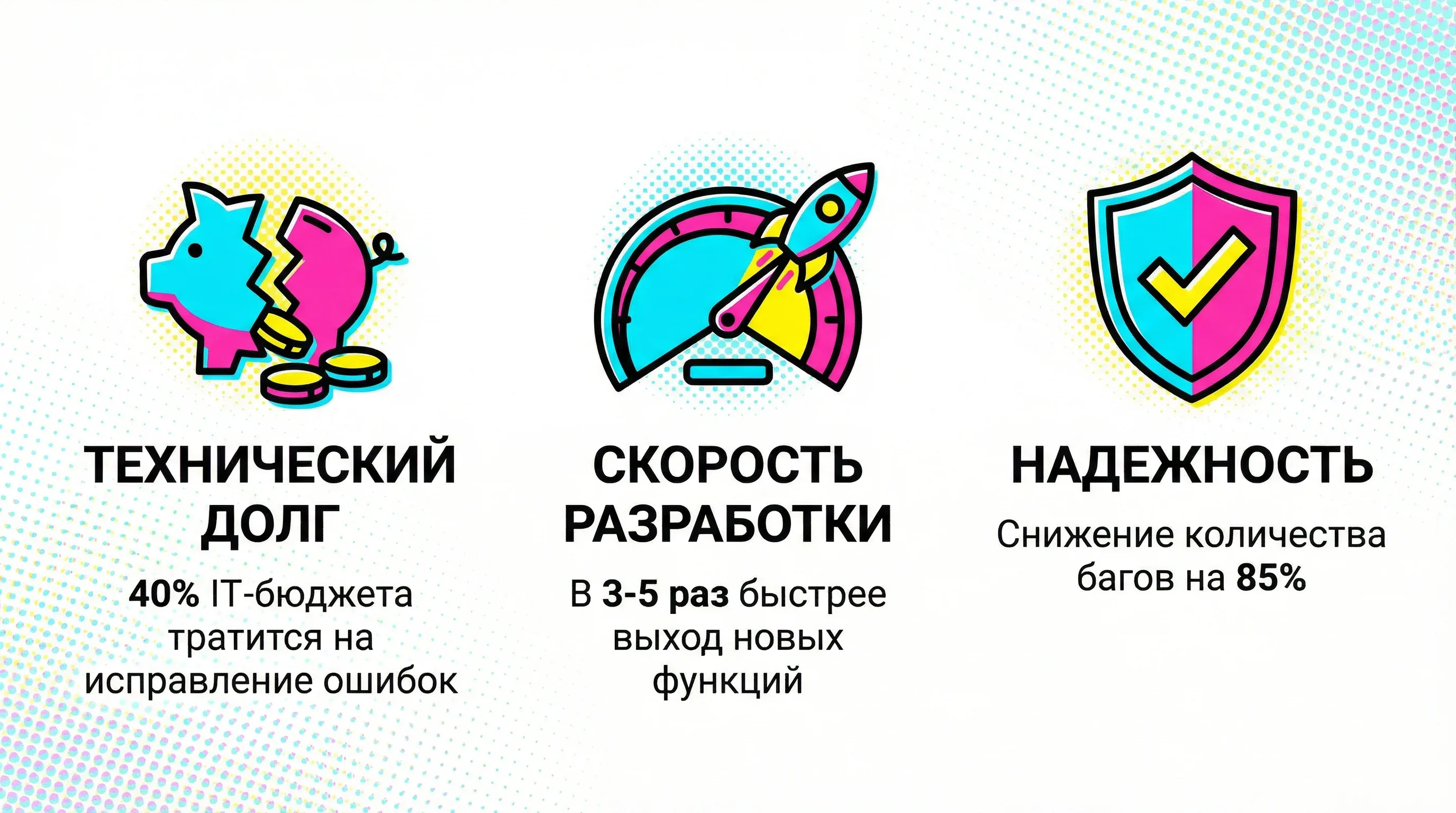 Скорость разработки новых функций. В хорошо спроектированной системе добавление новой функции — это написание нового кода, а не переписывание старого. По нашему опыту, разница в скорости может достигать 3-5 раз. Представьте: конкурент выпускает функцию за неделю, а вам нужен месяц — и это при одинаковых командах.